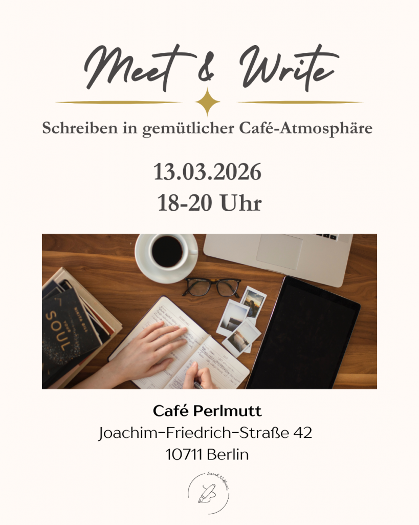 Jeden zweiten Freitag im Monat treffen wir uns im wunderschönen Café Perlmutt in Berlin-Charlottenburg zu einem gemütlichen Meet & Write. Nach offiziellem Ladenschluss dürfen wir von 18 bis 20 Uhr gemeinsam schreiben und uns austauschen. Wir bleiben eine kleine Gruppe von maximal 12 Menschen – damit wir genug Ruhe finden und sich auch die Introvertierten unter uns sicher und wohlfühlen ♥️ Eine Voranmeldung im Café oder über kontakt@sarahniklowitz.de wäre also ratsam – du kannst dir dein Ticket auch direkt über den Button sichern: