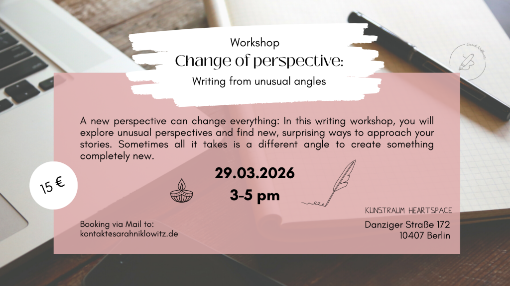 Instead of telling everything from your usual perspective, you try out new points of view: you write from other people’s voices, observe like a camera, slip into characters, things, or places. With playful exercises, short moments of mindfulness, and guided writing prompts, you break away from „this is how I always write“ and find completely new approaches to your texts.