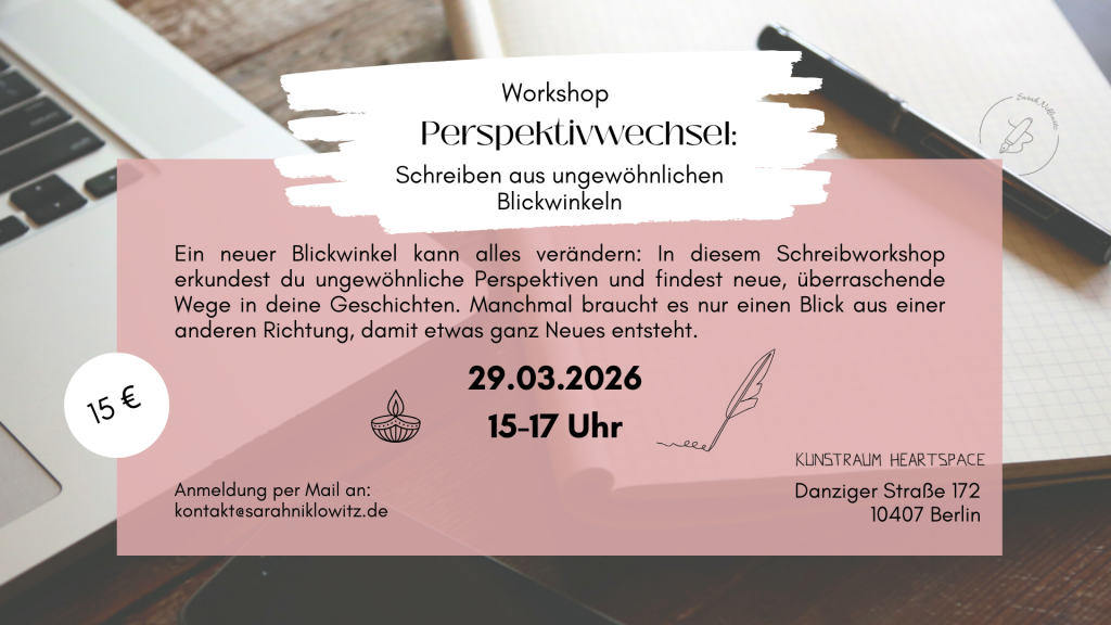 (English below) Du hast das Gefühl, deine Texte klingen alle ähnlich oder du bist einfach festgefahren in deiner Schreibroutine? Damit bist du in guter Gesellschaft – es muss aber nicht so bleiben! In diesem Schreibworkshop wechselst du bewusst die Perspektive und kannst deine Geschichten förmlich dabei beobachten, wie sie (wieder) lebendiger werden und dich vielleicht sogar überraschen 😉